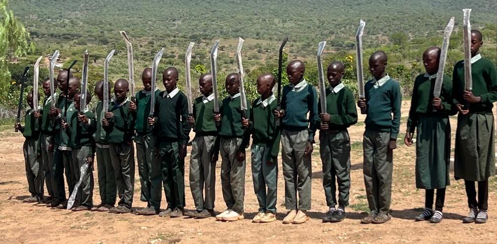 Damit die jungen Bäume gut gedeihen, wurde die Schule zusätzlich mit Macheten zum Kürzen des Grases und Entfernen von Unkraut ausgestattet.