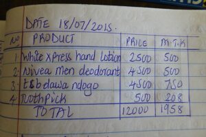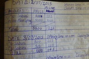 Wer „small business“ betreibt, braucht Geduld und Bescheidenheit. Die Tagesverdienste liegen oft nur bei 1 bis 2 Euro! Das zeigt die Buchführung. Am 18. 7. 2015 verkaufte sie vier Produkte. Der Reingewinn belief sich auf Tansania Shilling (Tsh.) 1958. Das bedeutet:  1 EURO Tagesverdienst!