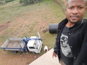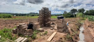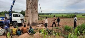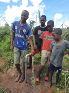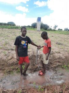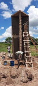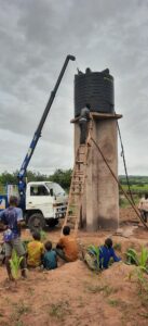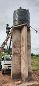 Es ist ein Osterfest!! Von einem Turm mit einem 5.000 Liter-Tank, in den wir das Wasser aus einem handgegrabenen Teich hochpumpen, können wir nun rechtzeitig zu Ostern für die Bauern Wasser auf die Felder „pumpen“.