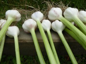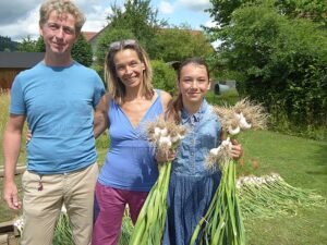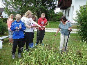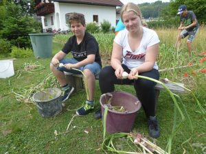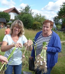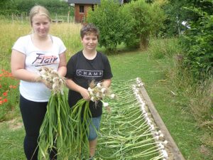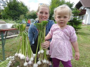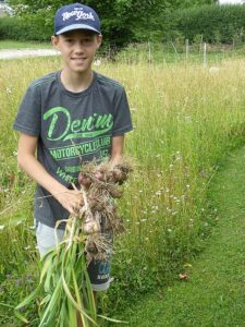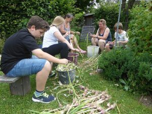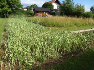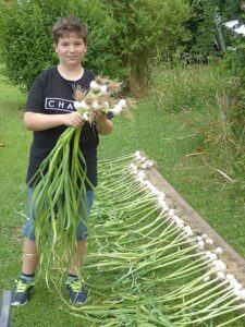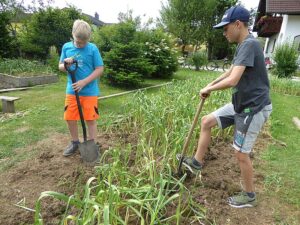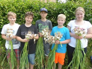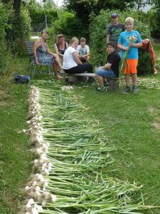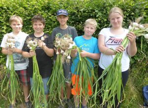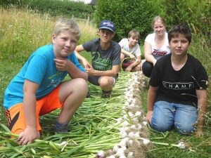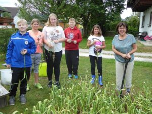 Heuer waren es wieder 1500 Knollen und erstmals kamen nach der Ankündigung in der Vöcklabrucker BEZIRKS-RUNDSCHAU am 1. Juli Gäste aus mehreren Orten aus dem Bezirk extra zu uns angereist, um direkt am schuleigenen Knoblauchfeld frisch geernteten Knoblauch und beste Ware zu erwerben. Noch am selben Tag waren wir zur Gänze ausverkauft.