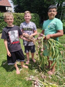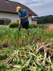 Bereits zum 10. Mal wurde im Juni Knoblauch geerntet. Im Juli wird noch eine zweite (späte) Sorte nachgeerntet. Wer also noch Knoblauch will, soll sich ab Mitte Juli auf den Weg zu Andrea und Markus Hagler machen. Gegen eine großzügige Spende für das Projekt erhalten Sie beste Ware. Schön ist es, wenn die Spende den „Materialwert“ übersteigt und so zu einer wirklichen Spende wird.